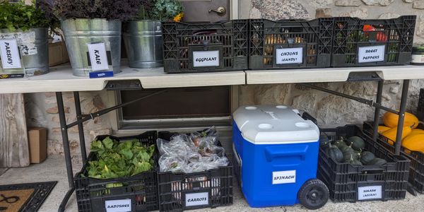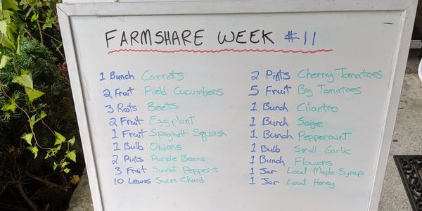 The produce is harvested close to the date or on the date of the pick-up. It's then prepared and set up in containers at the pick-up site. A whiteboard sign lists which items and their amount for each share. Once harvested, the farmer knows how much to divide the produce up evenly. Customers then fill their boxes with the amount of produce allowed to them. Early arriving clients get first choice of the produce.